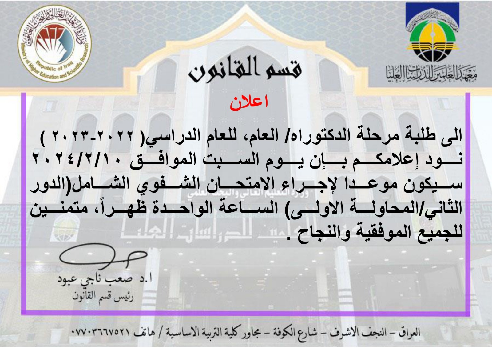 اعلان / الى طلبة الدكتوراه 2022 - 2023